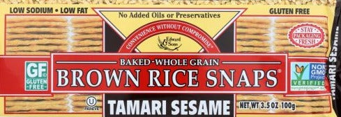 In 1978, Edward & Sons introduced the first Brown Rice Snaps®. Oven baked instead of fried, they pioneered a new generation of healthy, whole grain snacking. To create Tamari Sesame Brown Rice Snaps®, whole grain brown rice is carefully cleaned, and then milled into a fine flour containing the essential nutrients of the whole grain. Next, this whole grain rice flour is lightly steamed, kneaded, shaped, and oven-baked to golden perfection with no added oils. These flavorful snaps are completed with a dash of gluten-free tamari and sesame seeds. Suitable for gluten-free, low-sodium and low-fat diets. Kosher Certified and Non-GMO Project Verified.
