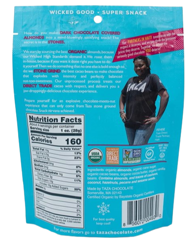 Ingredients: Organic almonds, organic cane sugar, organic cacao beans, organic cocoa butter, organic vanilla beans.