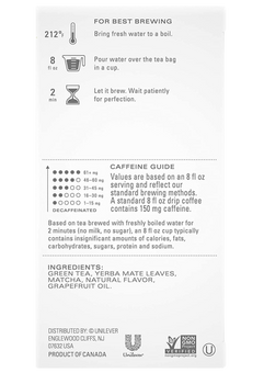 Ingredients: Green Tea, Yerba Mate Leaves, Matcha, Natural Flavor, Grapefruit Oil.