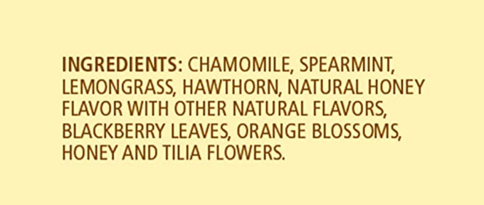 Ingredients:  Chamomile, Spearmint, Lemongrass, Tilia Flowers, Hawthorn, Natural Honey Flavor With Other Natural Flavors, Blackberry Leaves, Orange Blossoms And Honey.