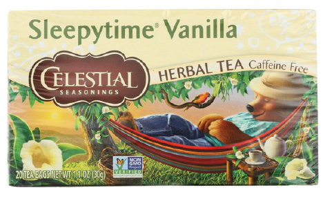 The Sleepytime Vanilla Herbal Tea Caffeine Free by Celestial Seasonings blends soothing chamomile, spearmint, and lemongrass with creamy vanilla for a calming bedtime tea.