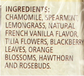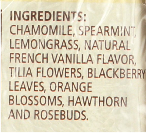 Ingredients: Chamomile, spearmint, lemongrass, natural french vanilla flavor, blackberry leaves, hawthorn, orange blossoms, tilia flowers and rosebuds.