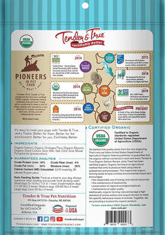 Introducing, the first certified organic smoked salmon jerky treat! We start with Icelandic organic salmon as the #1 ingredient. The salmon is then smoked in a real smoker! Providing your pets with premium ingredients is our top priority at Tender & True Pet Nutrition.
