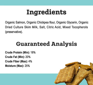 Ingredients: Organic Salmon, Organic Chickpea Flour, Organic Glycerin, Organic Dried Culture Skim Milk, Salt, Citric Acid, Mixed Tocopherols (Preservative).