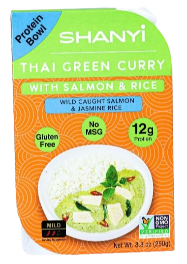 Ingredients: Green Curry Salmon Sauce: Wild Caught Salmon, Coconut Milk, Green Curry Paste, Shallot, Sweet Basil., Jasmine Rice: Jasmine Rice And Rice Bran Oil.