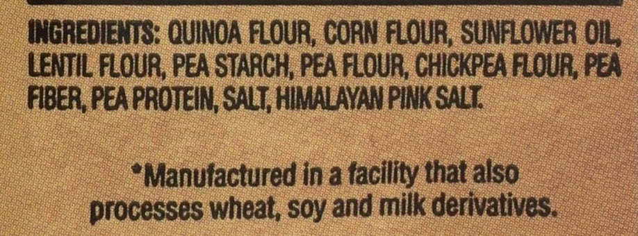 Ingredients: Quinoa Flour, Corn Flour, Sunflower Oil, Lentil Flour, Pea Starch, Pea Flour, Chickpea Flour, Pea Fiber, Pea Protein, Salt, Himalayan Pink Salt.