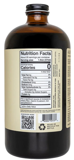 Ingredients: Filtered Water, Organic Coffee, Chicory, Organic Caffeine Extracted From Coffee Beans.