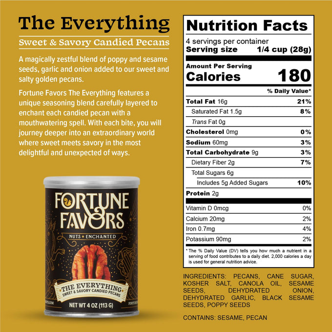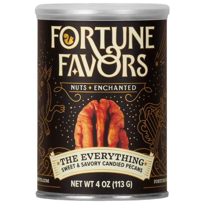 Fortune Favors transforms the humble pecan into an extraordinary snack with bold flavors and a health-conscious twist. The Everything Candied Pecans combine a magically zestful blend of poppy and sesame seeds, garlic, and onion with a perfectly balanced sweet and salty crunch.