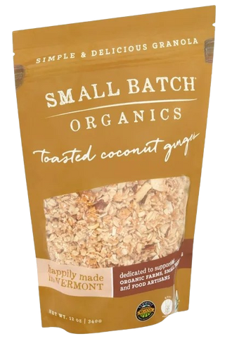 Ingredients: Oats*, Maple Syrup*, Coconut Chips*, Almonds*, Cornflakes* (Cornmeal, Fruit Juice), Sprouted Quinoa*, Virgin Coconut Oil*, Brown Rice Flour*, Cane Sugar*, Vanilla Extract*, Sea Salt, Ginger*. * Organic