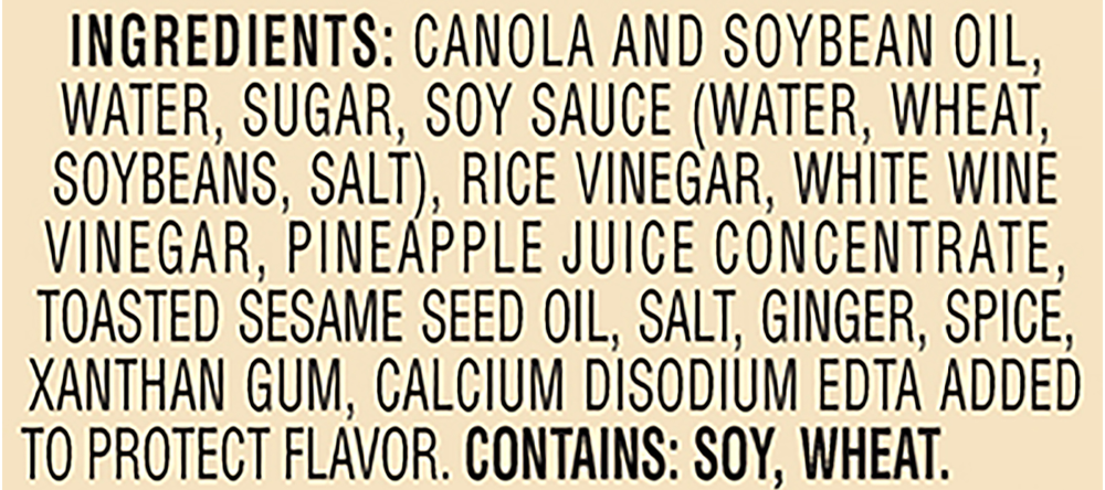 Ingredients: Canola and Soybean Oil, Water, Sugar, Soy Sauce (Water, Wheat, Soybeans, Salt), Rice Vinegar, White Wine Vinegar, Pineapple Juice Concentrate, Toasted Sesame Seed Oil, Salt, Ginger, Spice, Xanthan Gum, Calcium Disodium EDTA Added to Protect Flavor.