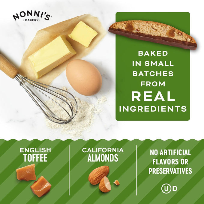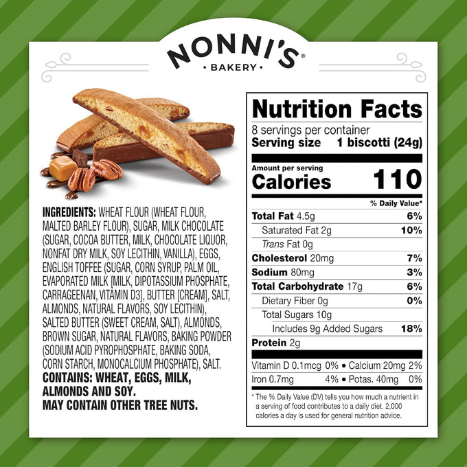 Ingredients: Wheat Flour (Wheat Flour, Malted Barley Flour), Sugar, Milk Chocolate (Sugar, Cocoa Butter, Milk, Chocolate Liquor, Nonfat Dry Milk, Soy Lecithin [an Emulsifier], Vanilla), Eggs, English Toffee (Sugar, Corn Syrup, Palm Oil, Evaporated Milk [milk, Dipotassium Phosphate, Carrageenan, Vitamin D3], Butter [cream], Salt, Almonds, Natural Flavors, Soy Lecithin), Salted Butter (Sweet Cream, Salt), Almonds, Brown Sugar, Natural Flavors, Baking Powder (Sodium Acid Pyrophosphate, Baking Soda, Corn Starch, Monocalcium Phosphate), Salt.