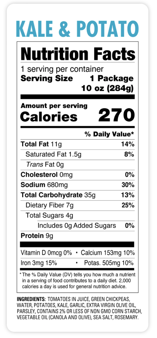 Ingredients: Tomatoes In Juice, Green Chickpeas, Water, Potatoes, Kale, Garlic, Extra Virgin Olive Oil, Parsley, Contains 2% Or Less Of Non Gmo Corn Starch Vegetable Oil (Canola And Olive), Sea Salt, Rosemary.