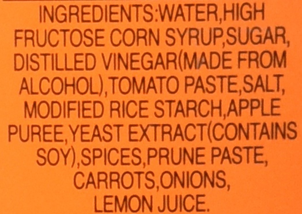 Ingredients: Water, High Fructose Corn Syrup, Sugar, Distilled Vinegar (Made From Alcohol), Tomato Paste, Salt, Modified Rice Starch, Hydrolyzed Vegetable Protein (Contains Soy), Apple Puree, Spices, Yeast Extract, Prune Paste, Carrots, Onions, Lemon Juice.