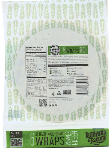 Ingredients: Water, Oat Fiber, Unbleached Wheat Flour, Wheat Gluten, Soy Flour, Expeller Pressed Canola Oil, Contains 2% Or Less Of Each Of: Kale, Spinach, Swiss Chard, Parsley, Citric Acid, Garlic, Guar Gum, Non-Aluminum Baking Powder (Sodium Acid Pyrophosphate, Sodium Bicarbonate, Corn Starch, Monocalcium Phosphate), Onion, Sea Salt, Xanthan Gum, To Maintain Freshness (Sorbic Acid, Calcium Propionate).