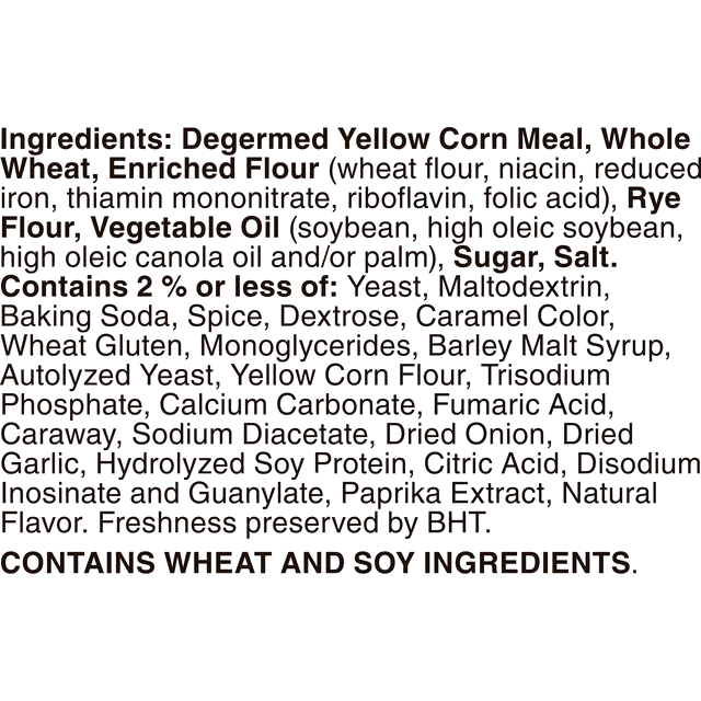 Ingredients: Degermed Yellow Corn Meal, Whole Wheat, Enriched Flour (wheat flour, niacin, reduced iron, thiamin mononitrate, riboflavin, folic acid), Rye Flour, Vegetable Oil (soybean, high oleic soybean, high oleic canola oil and/or palm), Sugar, Salt. Contains 2 % or less of: Yeast, Maltodextrin, Baking Soda, Spice, Dextrose, Caramel Color, Wheat Gluten, Monoglycerides, Barley Malt Syrup, Autolyzed Yeast, Yellow Corn Flour, Trisodium Phosphate, Calcium Carbonate, Fumaric Acid, Caraway, Sodium Diacetate, Dried Onion, Dried Garlic, Hydrolyzed Soy Protein, Citric Acid, Disodium Inosinate and Guanylate, Paprika Extract, Natural Flavor. Freshness preserved by BHT.