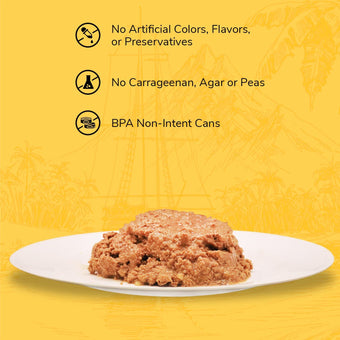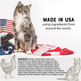 Ingredients: Chicken, chicken broth, chicken Liver, Ground Brown Rice, Brewers Yeast, Dried, Egg, Guar Gum, Potassium Chloride, Vitamins (Vitamin E supplement, Niacin, L-Ascorbyl-2-polyphosphate, Thiamine Mononitrate, Calcium Pntothenate, Vitamin A Acetate, Folic Acid, Riboflavin, Biotin, Pyridoxine Hydrochloride, Vitamin B12 Supplement, Vitamin D3 Supplements), Minerals (Zinc Sulfate, Ferrous Sulfate, Zinc Proteinate, Copper Sulfate, Manganese Sulfate, Copper Proteinate, Sodium Selenite, Manganese Proteinate, Potassium Iodide)Yucca Schidigera, Taurine.