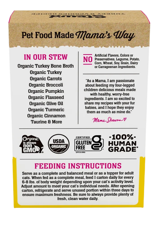 Ingredients: Organic Turkey Bone Broth, Organic Turkey, Organic Carrots, Organic Tapioca Starch, Organic Broccoli, Organic Pumpkin, Organic Flaxseed, Organic Olive Oil, Tricalcium Phosphate, Organic Turmeric, Organic Cinnamon, Taurine, Vitamins (Niacin Supplement, Vitamin E Supplement, Vitamin A Supplement, Thiamine Mononitrate, Dcalcium Pantothenate, Riboflavin Supplement, Pyridoxine Hydrochloride, Vitamin D3 Supplement, Vitamin B12 Supplement, Folic Acid, Biotin), Choline Chloride, Minerals (Iron Amino Acid Chelate, Zinc Amino Acid Chelate, Copper Amino Acid Chelate, Manganese Amino Acid Chelate, Potassium Iodide, Sodium Selenite).