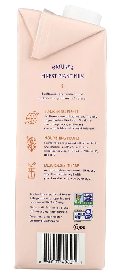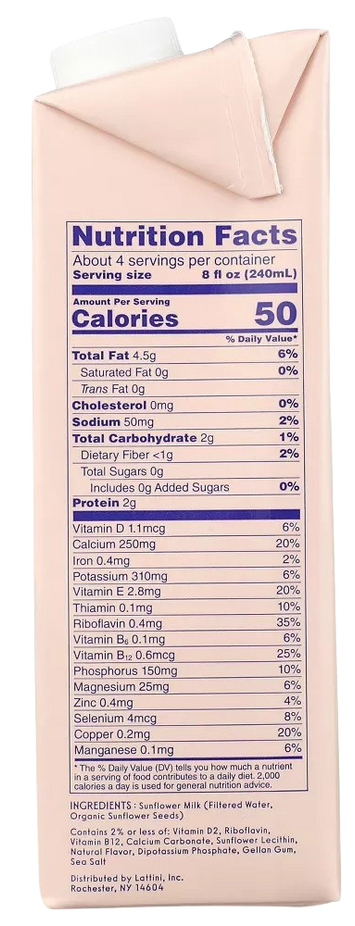 Ingredients: Sunflower Milk (Filtered Water, Organic Sunflower Seeds) Contains 2% Or Less Of: Vitamin D2, Riboflavin, Vitamin B12, Calcium Carbonate, Sunflower Lecithin, Natural Flavor, Dipotassium Phosphate, Gellan Gum, Sea Salt.