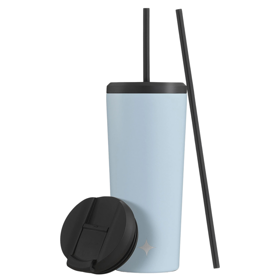 The JoyJolt vacuum insulated tumbler in blue (20 oz) delivers versatile sipping with both straw and flip lids to suit any beverage on the go.