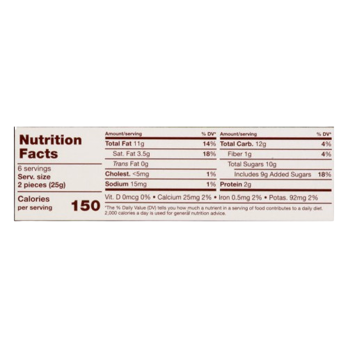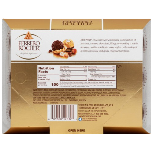 Ingredients: Milk Chocolate (Sugar, Cocoa Butter, Cocoa Mass, Skim Milk Powder, Butteroil, Lecithin As Emulsifier (Soy), Vanillin: an Artificial Flavor), Hazelnuts, Sugar, Palm Oil, Wheat Flour, Whey (Milk), Low Fat Cocoa Powder, Lecithin as Emulsifier (Soy), Sodium Bicarbonate As Leavening Agent, Salt, Vanillin: an Artificial Flavor.
