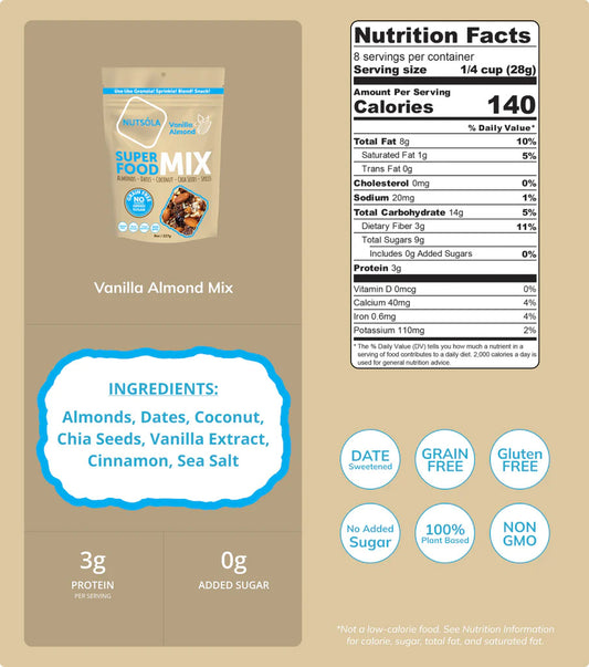 Ingredients: Almonds, Dates, Coconut, Chia Seeds, Vanilla Extract, Cinnamon, Sea Salt.