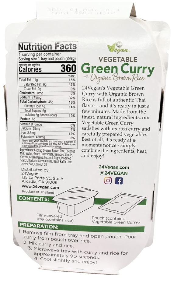 Ingredients: Cooked Organic Brown Rice, Coconut Milk, Water, Green Curry Paste, Bamboo Shoots, Carrots, Green Beans, Coconut Sugar, Modified Starch, Red And Green Chilies, Basil, Kaffir Lime Leaves, Salt, Coconut Oil.