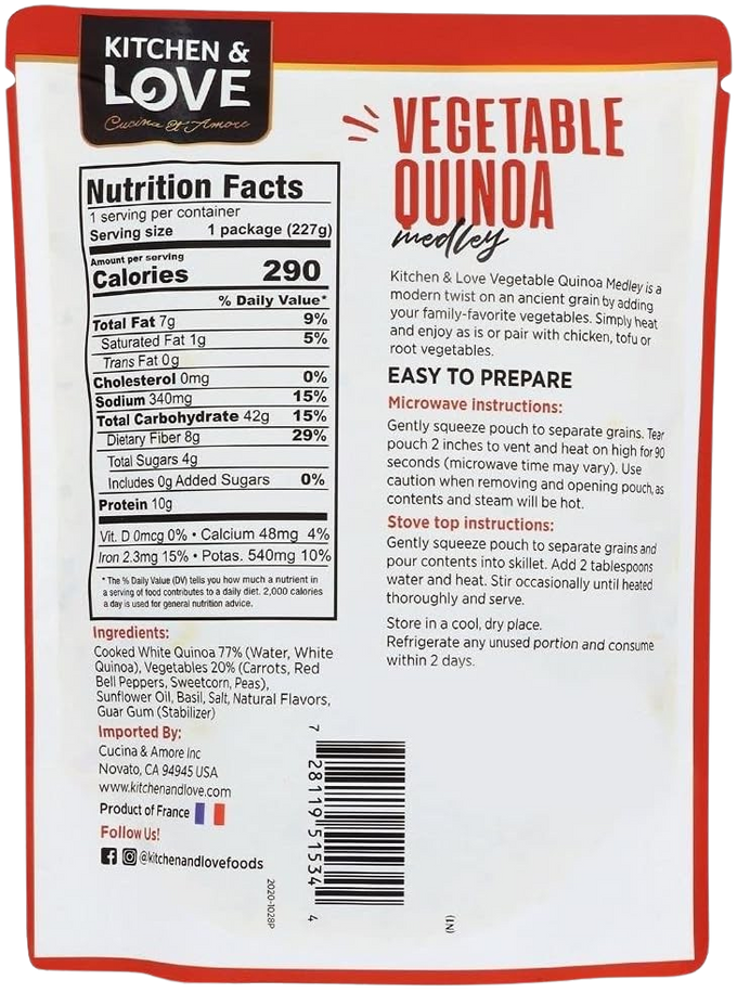 Ingredients: Cooked White Quinoa 77% (Water, White Quinoa), Vegetables 20% (Carrots, Red Bell Peppers, Sweetcorn, Peas), Sunflower Oil, Basil, Salt, Natural Flavors, Guar Gum (Stabilizer).