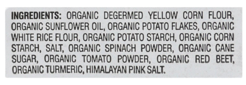 Ingredients: Organic Corn Flour, Organic Sunflower And/Or Organic Safflower Oil, Organic Potato Flour, Organic Potato Starch, Organic Corn Starch, Organic Rice Flour, Sea Salt, Organic Cane Sugar, Organic Spinach Powder, Organic Tomato Powder, Organic Beet Powder, Organic Turmeric, Himalayan Pink Salt.