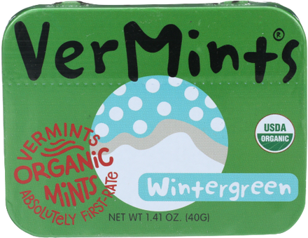 Ingredients: Organic Crystallized Cane Sugar, Organic Tapioca Syrup, Organic Maple Syrup, Natural Wintergreen Oil, Organic Peppermint Leaves, Agar, Gum Tragacanth