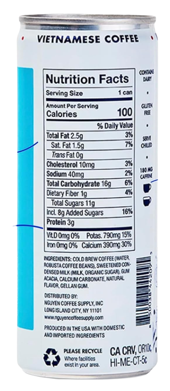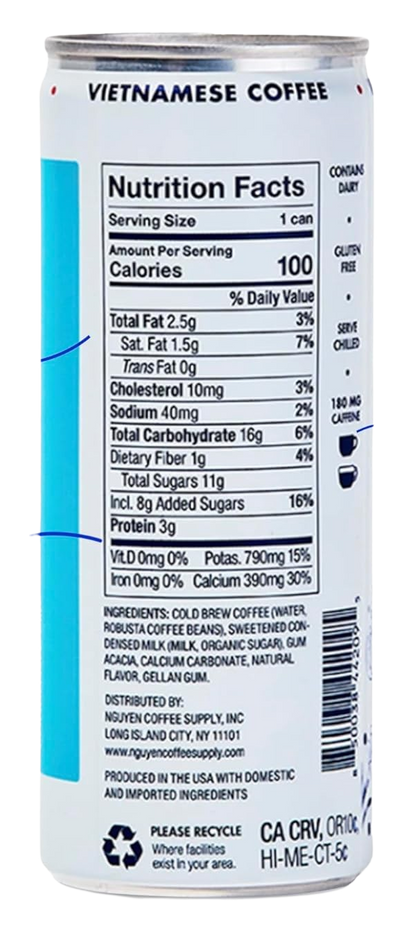 Ingredients: Cold Brew Coffee (Water Robusta Coffee Beans), Sweetened Condensed Milk (Milk, Organic Sugar), Gum Acacia, Calcium Carbonate, Natural Flavor, Gellan Gum.
