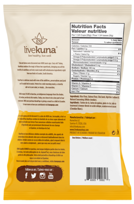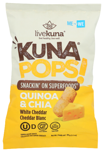Ingredients: Rice Flour, Quinoa Flour, Chia Seeds, High Oleic Sunflower Oil, Natural Seasoning (White Cheddar).