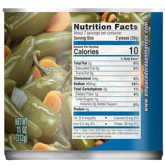 Ingredients: Jalapeno Peppers, Water, Vinegar, Carrots, Salt, Onions, Canola Oil, Sugar, Spices and Garlic.
