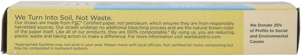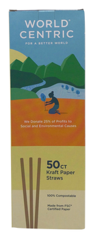 World Centric compostable wrapped 8 inch kraft paper straws are made from FSC Certified paper from sustainable sources. They are BPA, phthalate and PVC free. The straws are durable, strong and hold up in a variety of beverages. Great for cold drinks at coffee shops, restaurants, bars, and cafes. These eco friendly straws conform with FDA, ISO, and ASTM standards for compostability, and will compost in 2 to 4 months in a commercial composting facility.