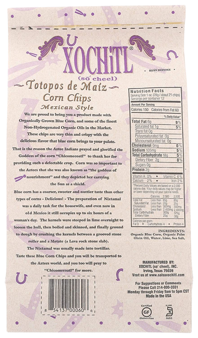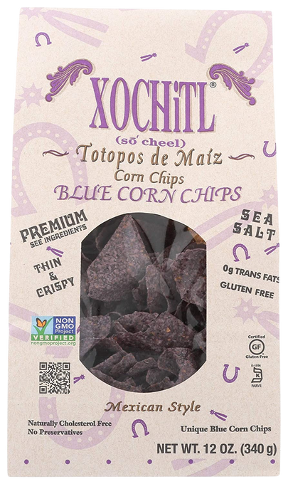 Xochitl Blue corn chips aren’t just another pretty chip. These artisan tortilla chips are made from the highest quality ingredients. They feature a slightly sweet and nutty taste that is unique in the blue corn chip world. Benefit call outs on the package (non-GMO, no trans-fat, no gluten) make these chips appealing to the chip loving, health conscious consumer. Blue chips can be enjoyed on their own or cross-sold with Xochitl salsa. Fits into a gluten-free lifestyle.