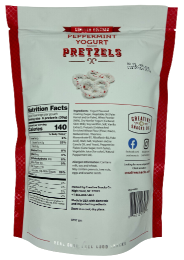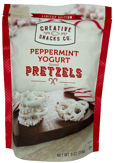 Ingredients: Yogurt Flavored Confectionery Coating (Sugar, Vegetable Oil [Palm Kernel And/Or Palm], Whey Powder [Milk], Dry Nonfat Yogurt [Milk], Soy Lecithin [An Emulsifier], Salt, Natural Vanilla Extract), Pretzels (Unbleached Enriched Wheat Flour [Flour, Niacin, Reduced Iron, Thiamine Mononitrate-B1,Riboflavin-B2, Folic Acid], Malt, Salt, Soybean And/Or Canola Oil, And Yeast), Peppermint Flakes (Sugar, Corn Syrup, Vegetable Juice Concentrate, Caramel Color, Natural Peppermint Oil).