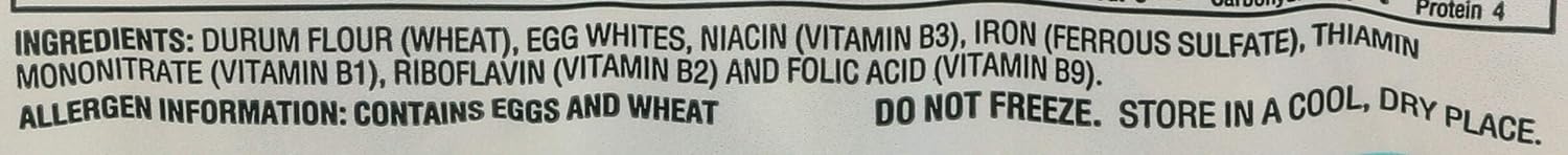 Ingredients: Durum Flour (Wheat), Egg Whites, Niacin (Vitamin B3), Iron (Ferrous Sulfate), Thiamin Mononitrate (Vitamin B1), Riboflavin (Vitamin B1) and Folic Acid (Vitamin B9).