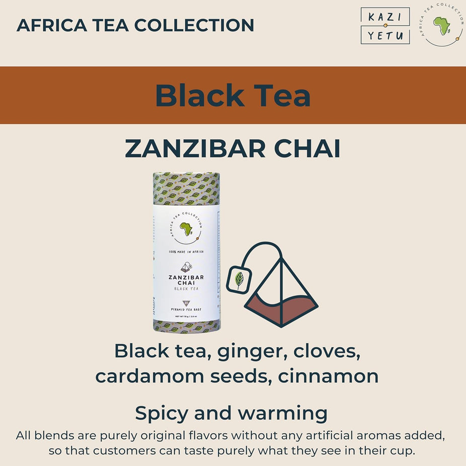 Kazi Yetu Zanzibar Chai Black Tea (20 ct) is a bold, spiced blend of black tea and traditional Tanzanian-grown spices for a rich and aromatic chai experience.
