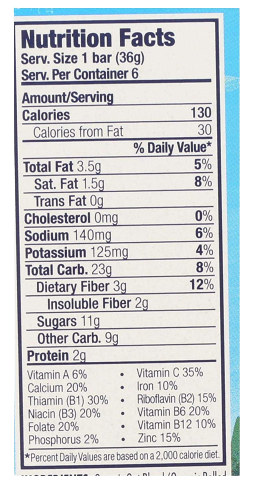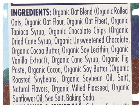 Ingredients: Calcium Carbonate, Dicalcium Phosphate, Ascorbic Acid (Vit. C), Ferric Orthophosphate (Iron), Zinc Oxide, Niacinamide (Vit. B3), Beta Carotene (Vit. A), Thiamine Mononitrate (Vit. B1), Riboflavin (Vit. B2), Pyridoxine Hydrochloride (Vit. B6), Folic Acid (Vit. B9), Cyanocobalamin (Vit. B12).","Organic Oat Blend (Organic Rolled Oats, Organic Oat Flour, Organic Oat Fiber), Organic Tapioca Syrup, Organic Chocolate Chips (Organic Dried Cane Syrup, Organic Unsweetened Chocolate, Organic Cocoa Butter, Organic Soy Lecithin, Organic Vanilla Extract), Organic Cane Syrup, Organic Fig Paste, Organic Cocoa, Organic Soy Butter (Organic Roasted Soybeans, Organic Soybean Oil, Salt), Natural Flavors, Organic Milled Flaxseed, Organic Sunflower Oil, Sea Salt, Baking Soda.
