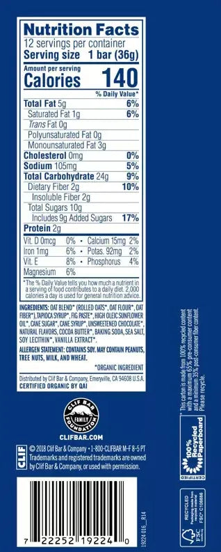 Ingredients: Oat Blend* (Rolled Oats*, Oat Flour*, Oat Fiber*), Tapioca Syrup*, Fig Paste*, Sunflower And/Or Soybean Oil*, Cane Sugar*, Cane Syrup*, Unsweetened Chocolate*, Natural Flavors, Cocoa Butter*, Baking Soda, Salt, Soy Lecithin*, Vanilla Extract*, Mixed Tocopherols (Antioxidant). *Organic Ingredient