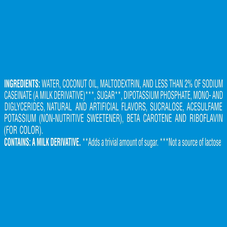 Ingredients: Water, Coconut oil, Maltodextrin, Less than 2% of sodium caseinate (a milk derivative), Sugar, Dipotassium phosphate, Mono- and diglycerides, Natural and artificial flavors, Sucralose, Acesulfame potassium (non-nutritive sweetener), Beta carotene (for color), Riboflavin (for color)