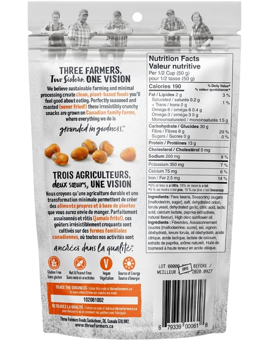 Ingredients: Fava Beans, Seasoning (Sugars [Maltodextrin, Sugar], Salt, Dehydrated Onion, Dehydrated Garlic, Yeast Extract, Citric Acid, Natural Flavor, Lactic Acid, Calcium Lactate, Paprika Extractives), High Oleic Sunflower Oil.
